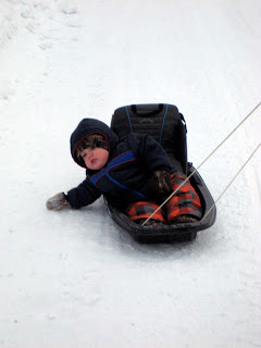 It warmed up to about 13F by 11:00am this morning so we all bundled up and took Tanner and the dogs for a walk. It was Tanner's first time in a sled. He loved it. He kept yelling at the dogs as they ran past, he leaned over the side to let his little hand drag, and smiled and laughed when he went over bumps!!! :)